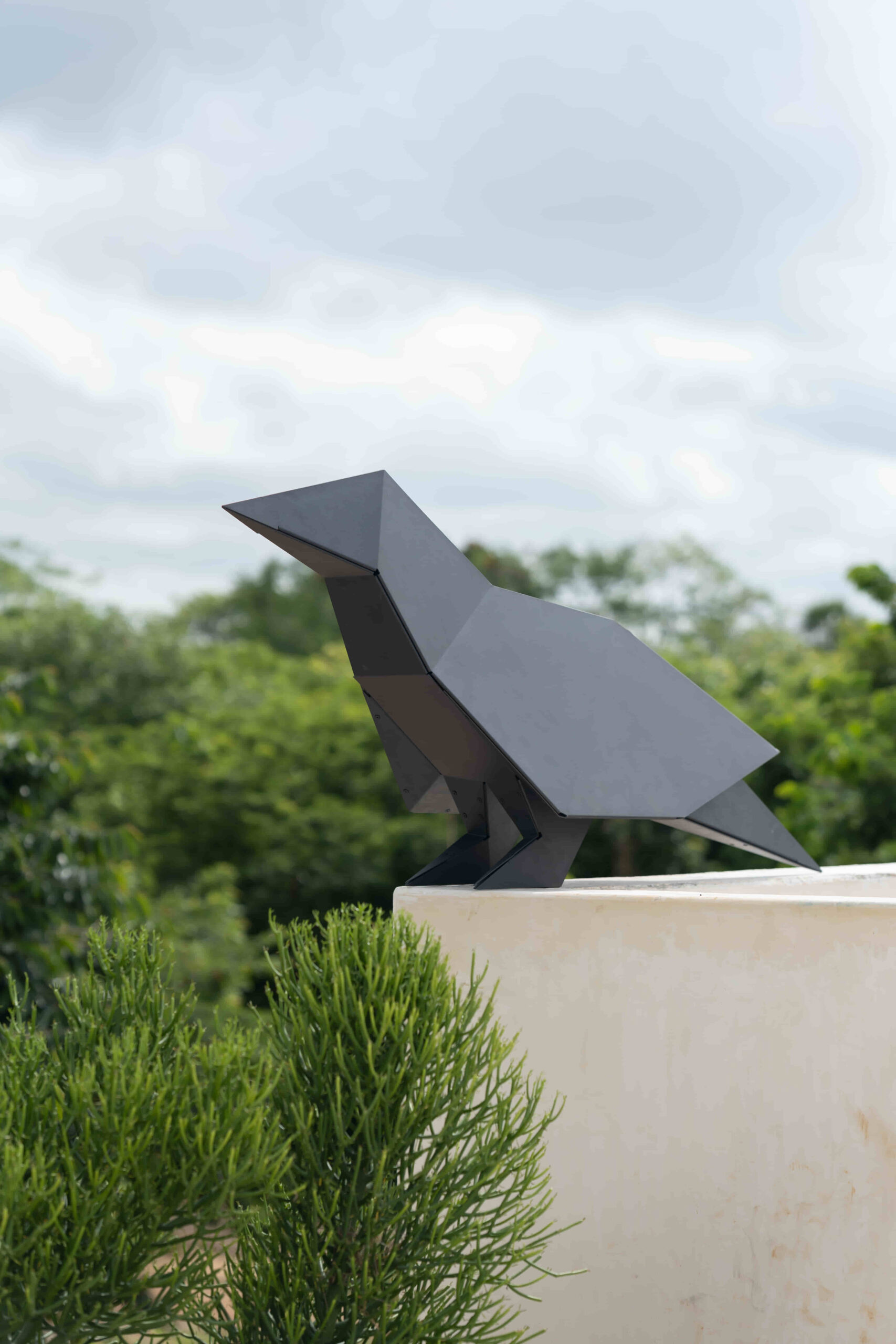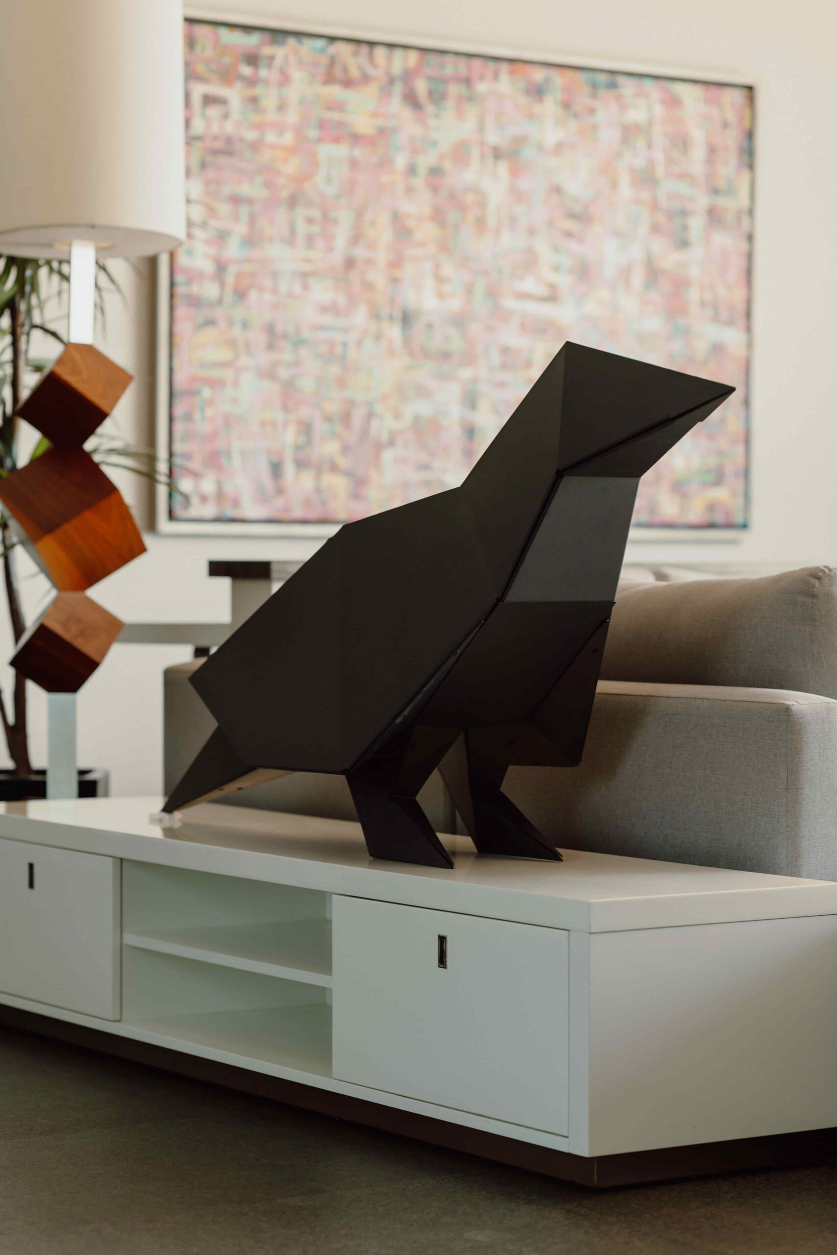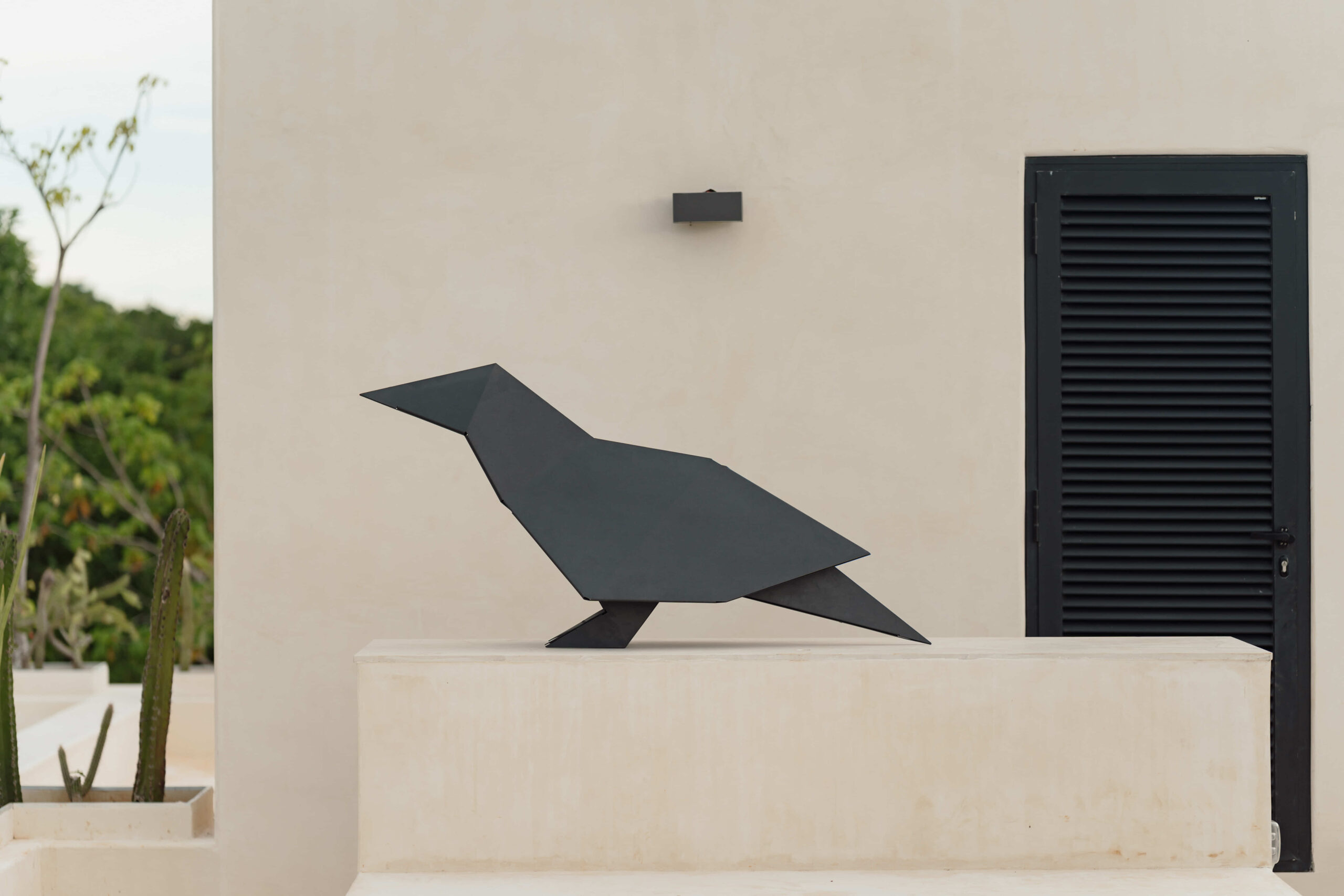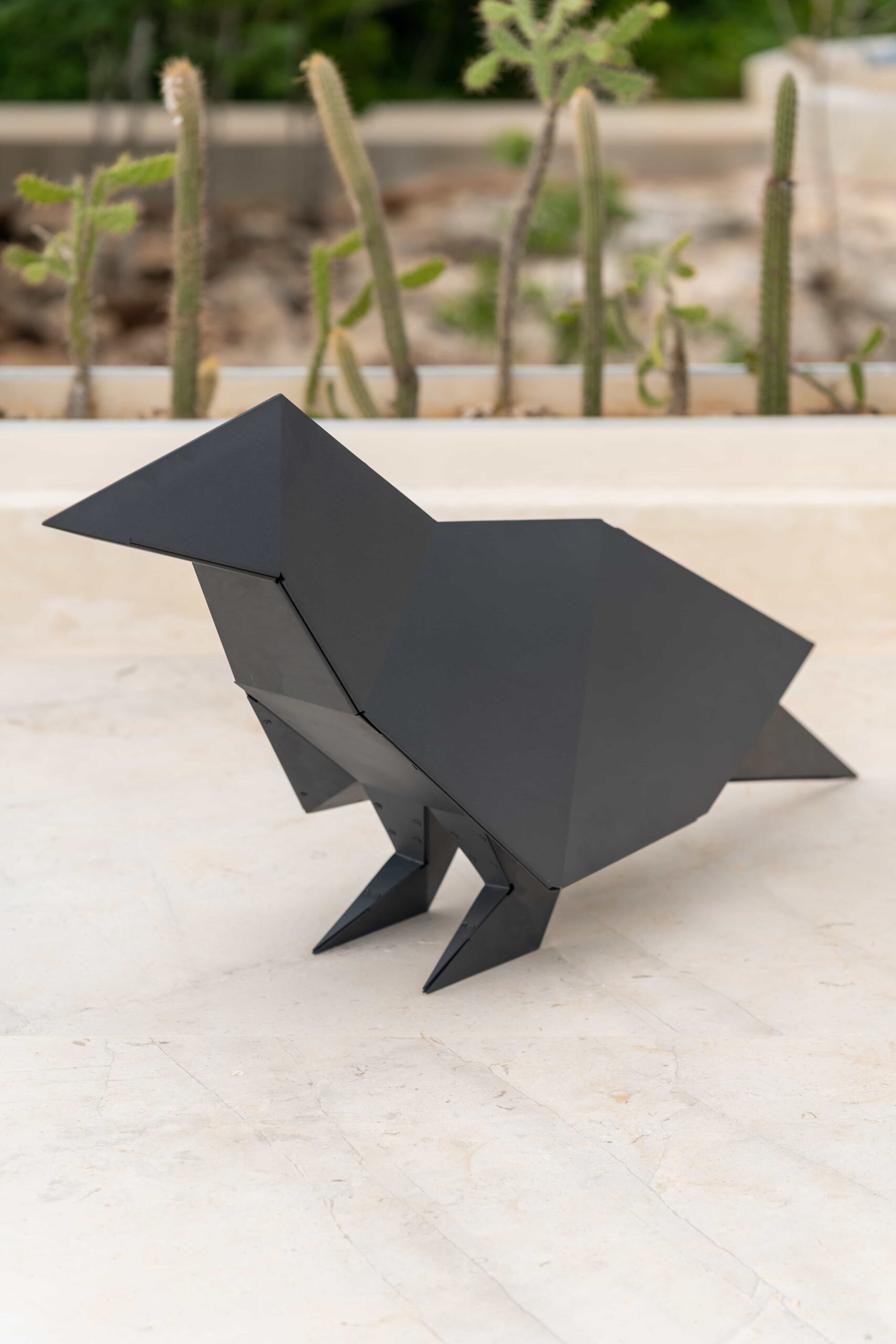 Los cuervos tienen una fama ambigua: han sido considerados como símbolos de la traición o de la sabiduría divina. El cuervo de Bestiario está posado sobre el piso y mira ligeramente hacia arriba, aún no sabemos si está esperando una señal o está preparándose para emprender el vuelo.