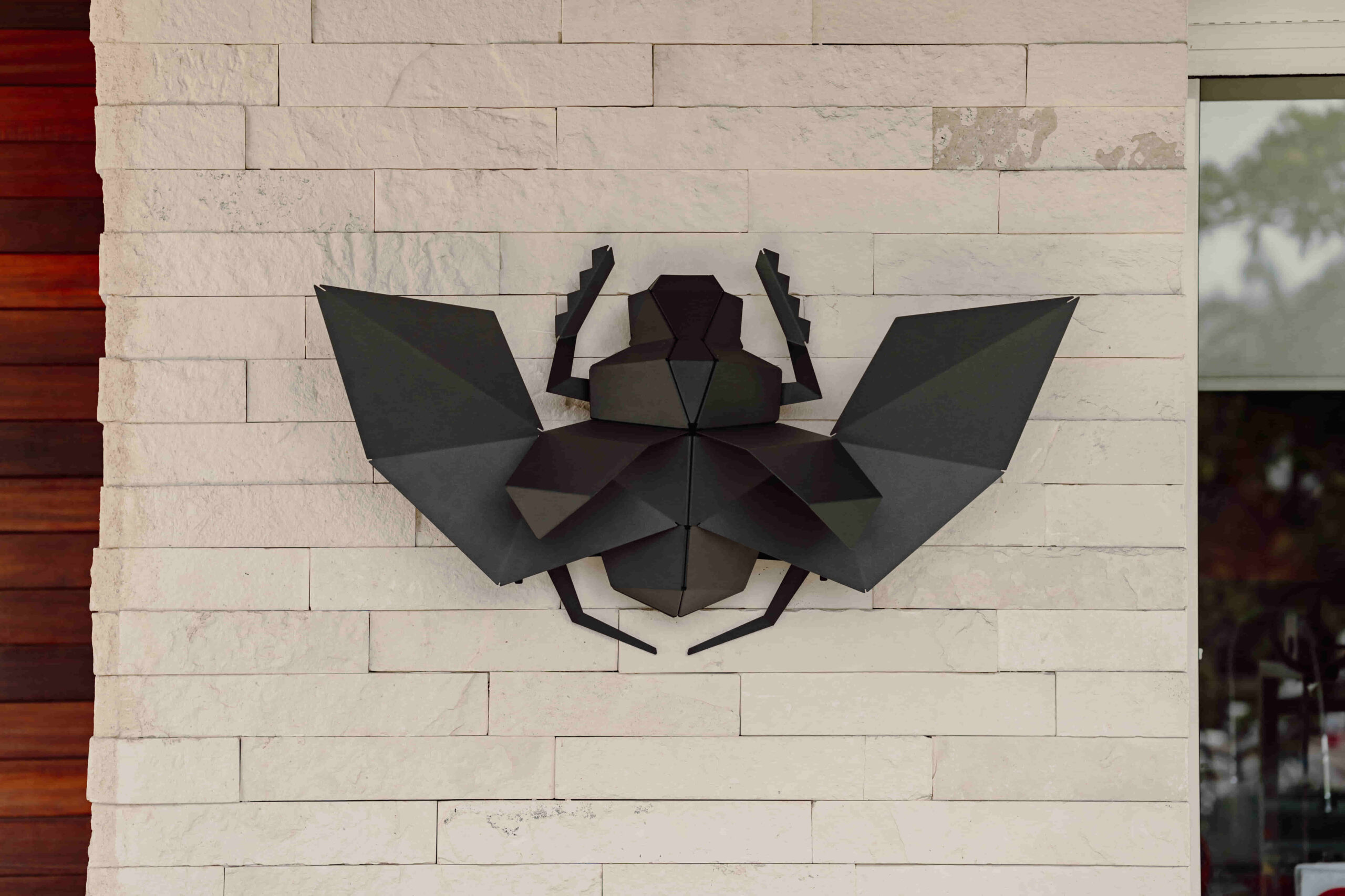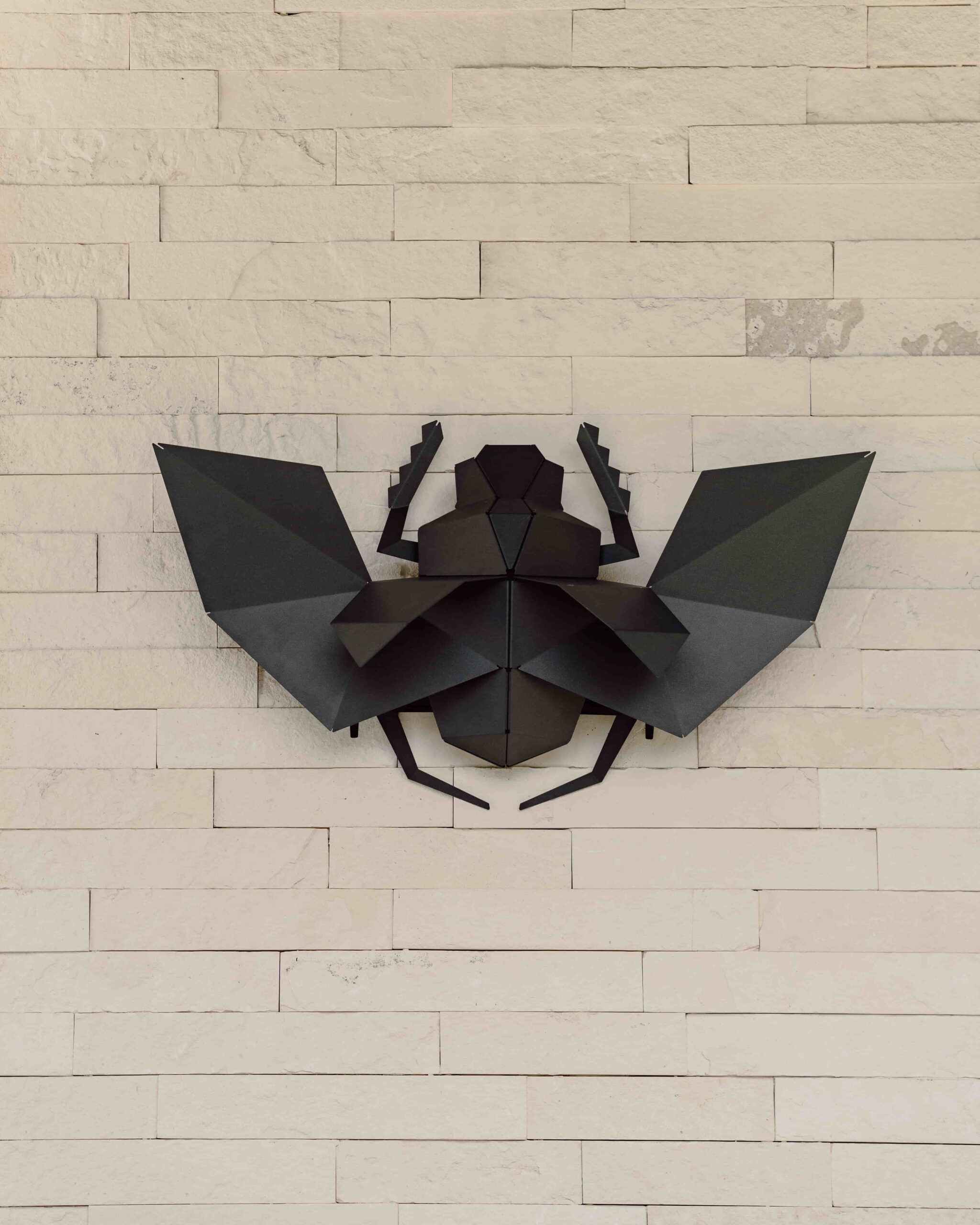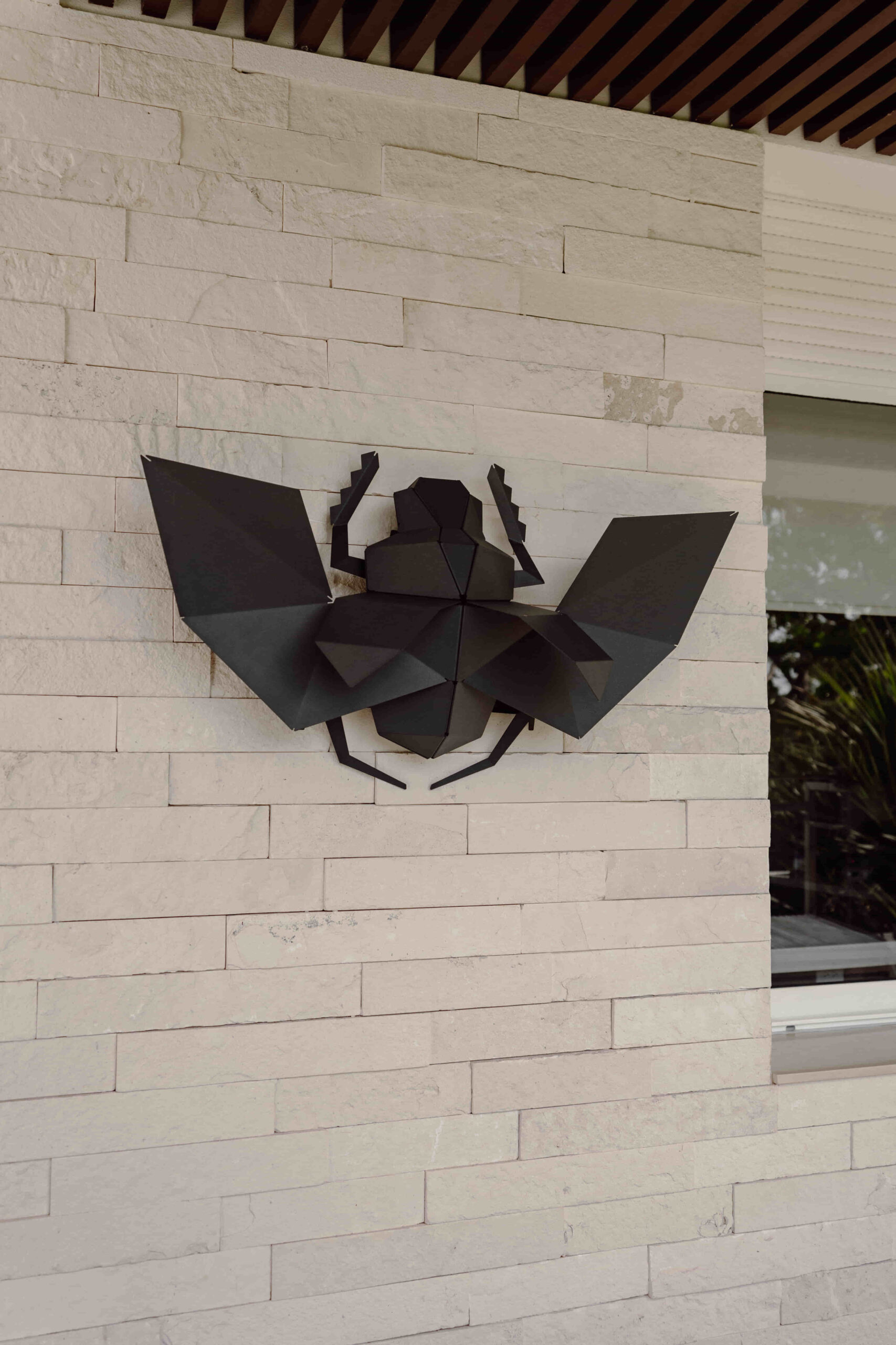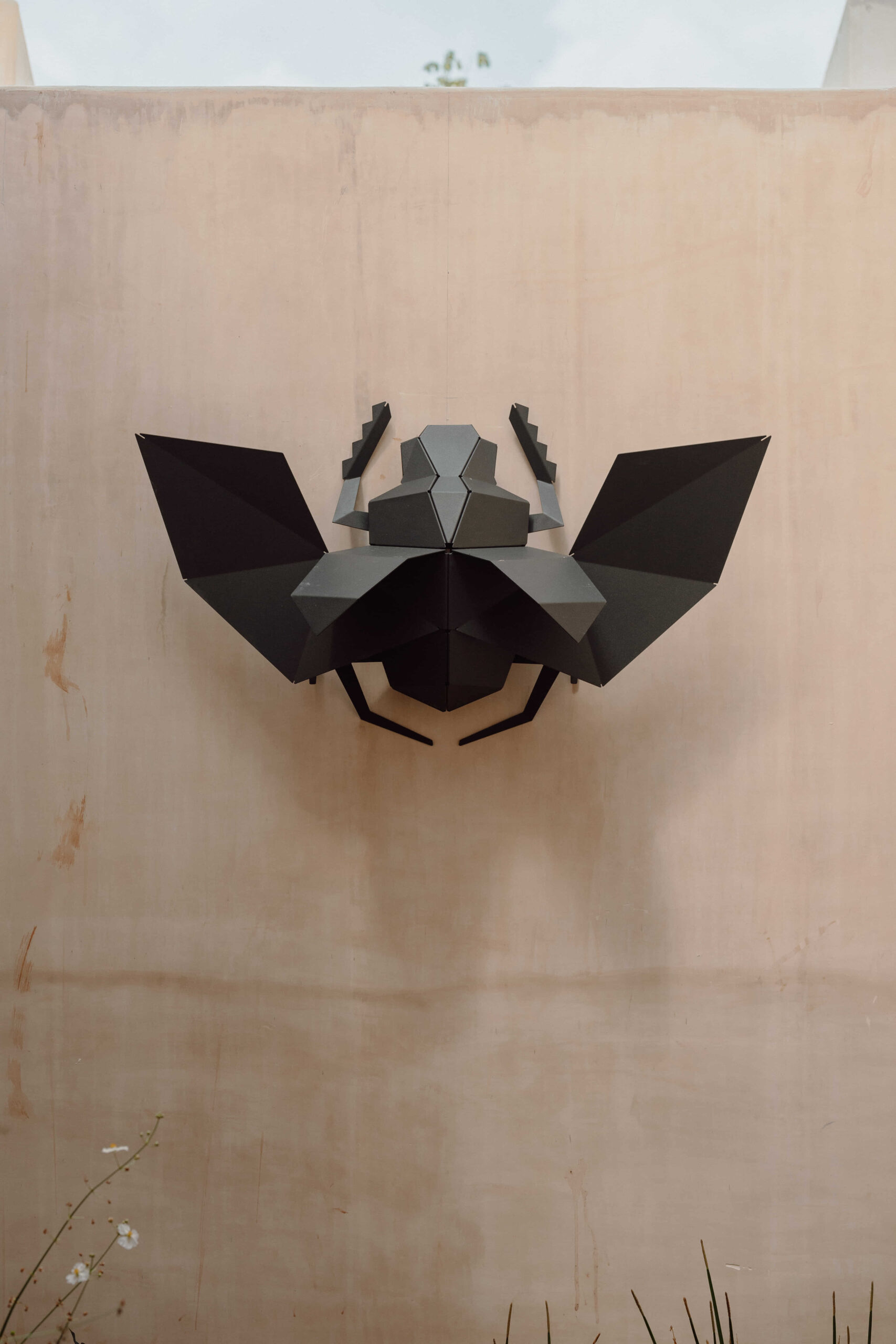 En Egipto, el escarabajo sagrado, habita templos, pirámides, tumbas: la vida y la muerte. Nuestro escarabajo encuentra una armonía entre la solidez del exoesqueleto y la ligereza de las alas. Visualmente nos coloca en una encrucijada: ¿está aterrizando o a punto de emprender vuelo? Nota: Esta Piezas incluye una base metálica para ser montada a un muro.