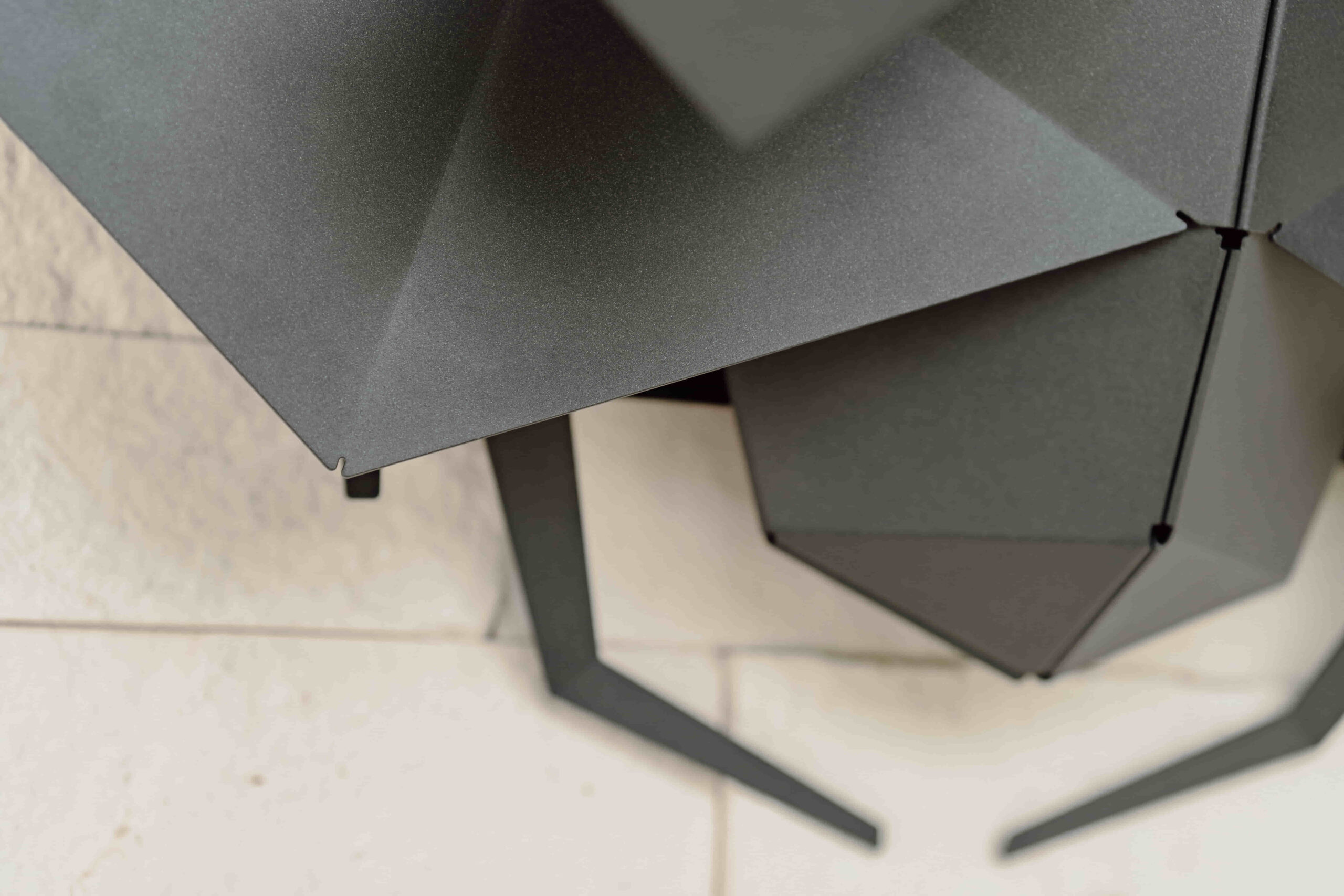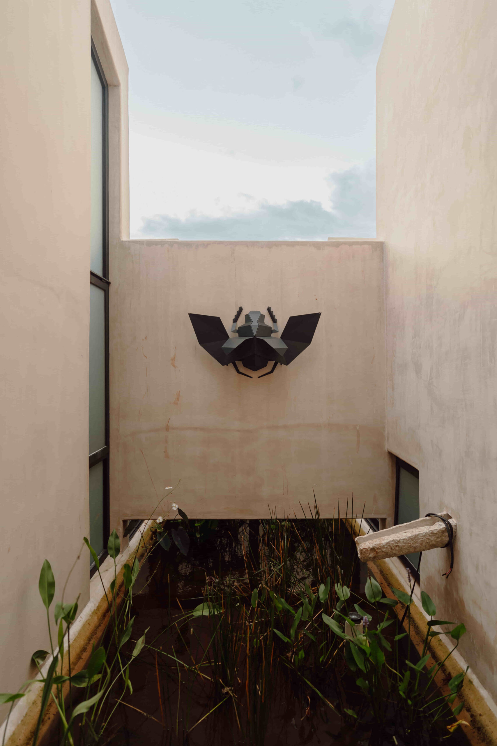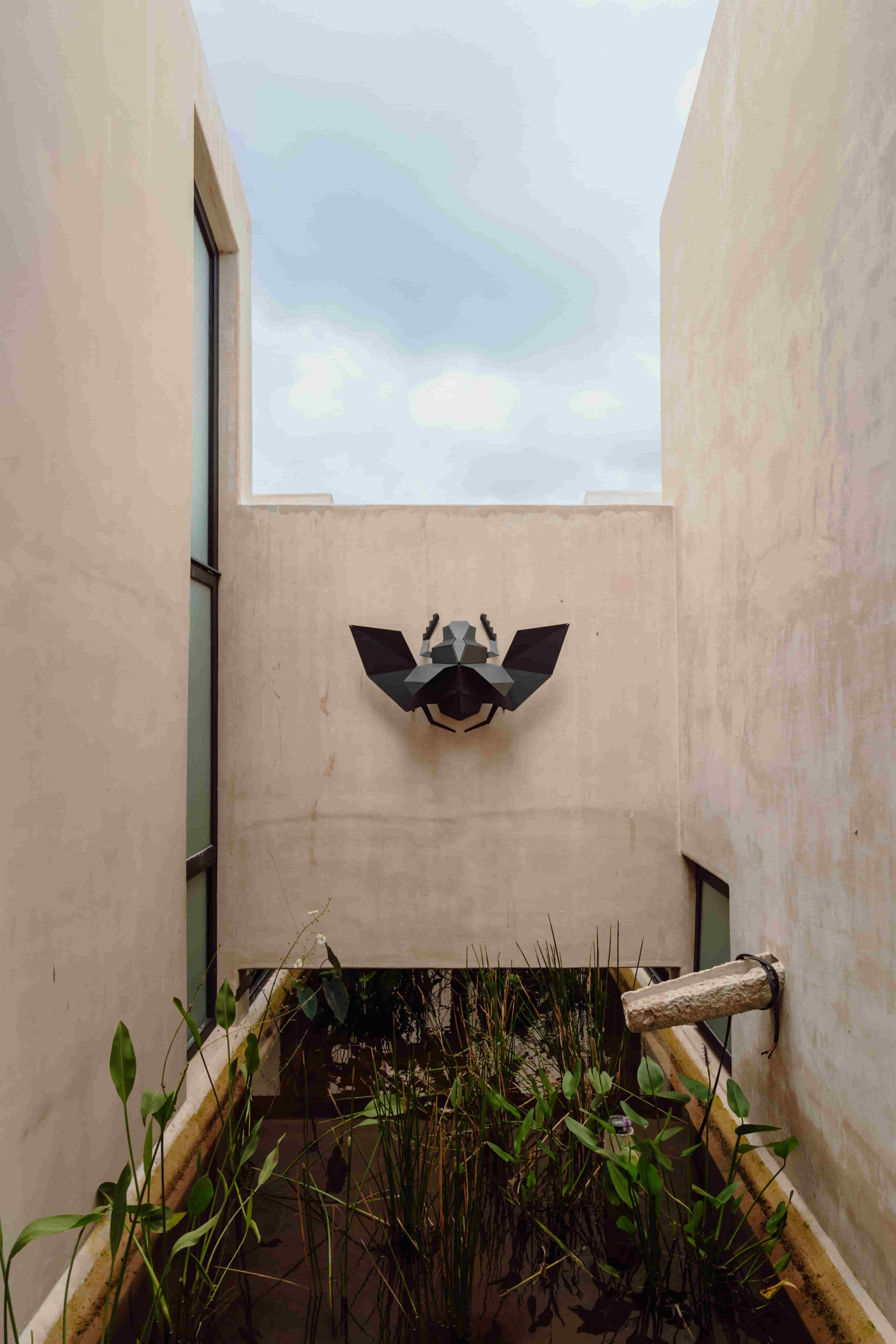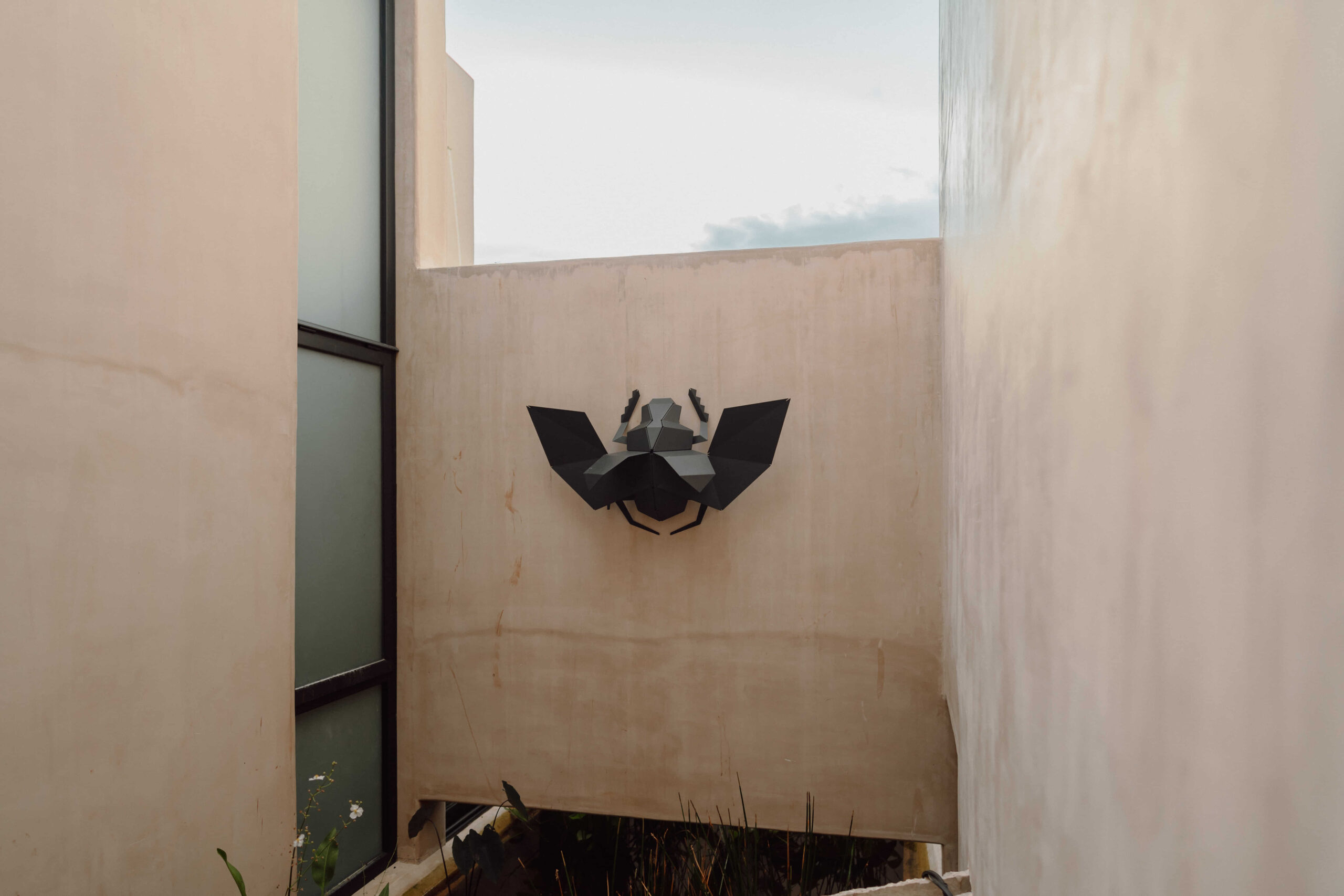 En Egipto, el escarabajo sagrado, habita templos, pirámides, tumbas: la vida y la muerte. Nuestro escarabajo encuentra una armonía entre la solidez del exoesqueleto y la ligereza de las alas. Visualmente nos coloca en una encrucijada: ¿está aterrizando o a punto de emprender vuelo? Nota: Esta Piezas incluye una base metálica para ser montada a un muro.